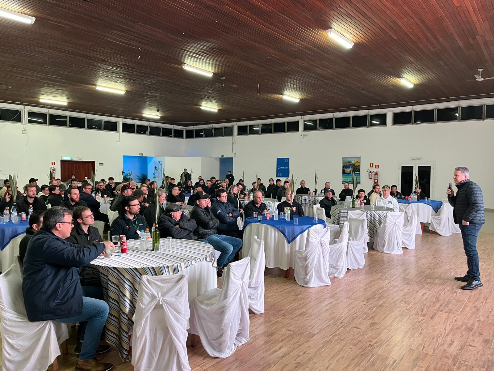 O engenheiro agrônomo da Timac Agro, Diego Berté, realizou a apresentação dos resultados do programa Colher Mais. Quem também representou a empresa foi o diretor comercial, Adriano Filippin, e o supervisor regional de vendas, Claudinei Santos.
