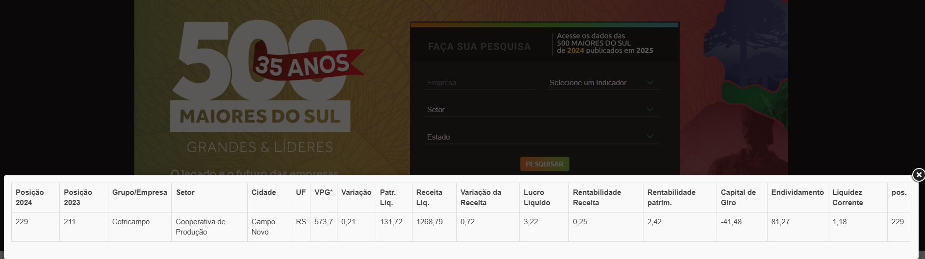 A Cotricampo celebra sua consolidação em um dos principais levantamentos que avaliam a pujança de empresas no cenário econômico regional. No ranking 500 Maiores do Sul 2025, elaborado pelo Grupo Amanhã, em parceria com a PwC Brasil, a cooperativa ocupa posição de destaque, figurando novamente entre as principais empresas da região Sul, na posição 229.