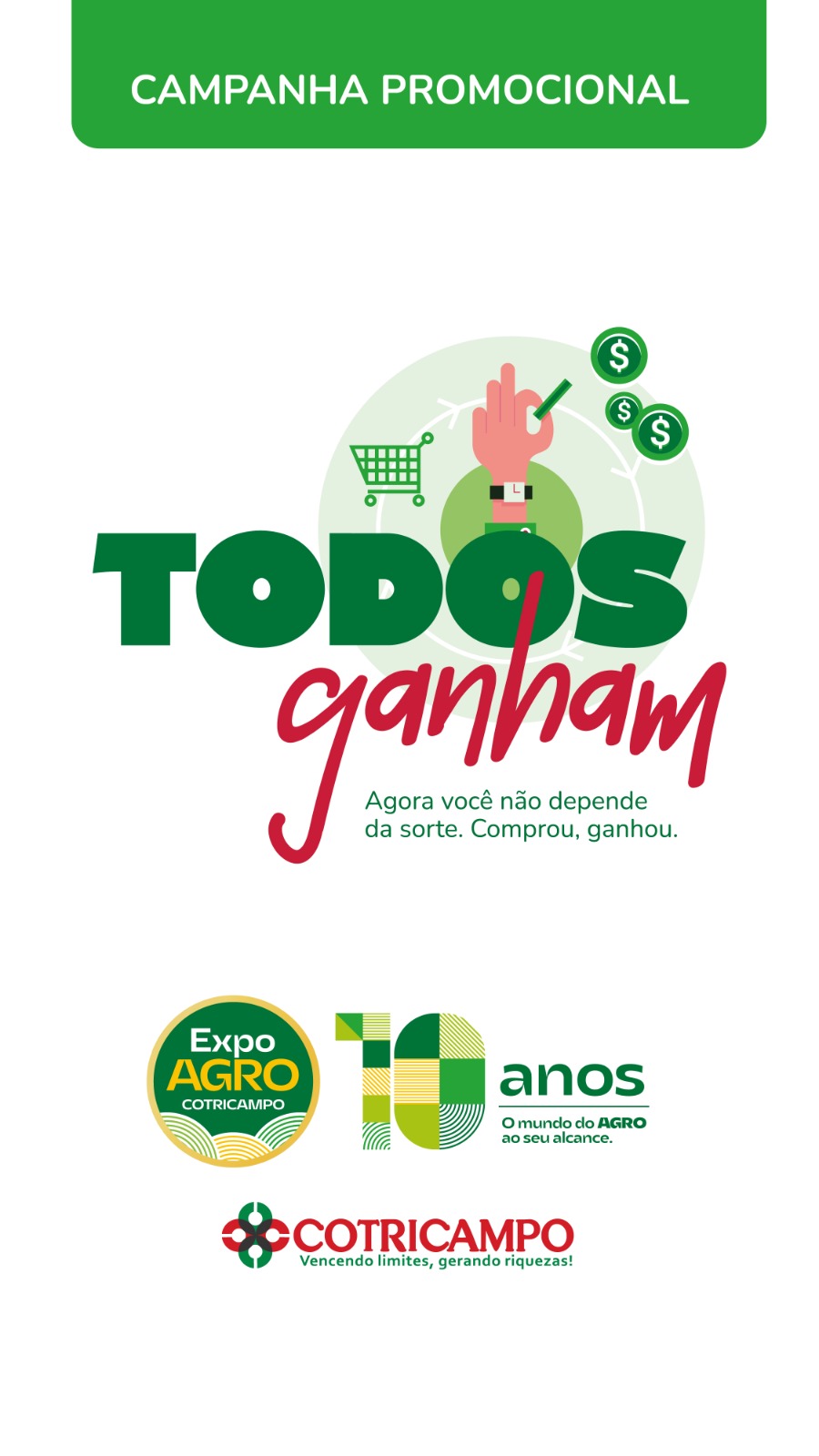 Como forma de comemorar essa edição histórica, a COTRICAMPO lança a campanha promocional “Todos ganham”. Com o slogan “Agora você não depende da sorte. Comprou, ganhou”, reforça o compromisso da cooperativa em gerar benefícios reais tanto para cooperados quanto para clientes em geral. A campanha oferece preços especiais em todos os pontos de venda da COTRICAMPO, permitindo que associados e clientes comprem mais, gastando menos. Além disso, os participantes do Programa de Pontos COTRICAMPO terão pontos em dobro nas compras de fevereiro, ampliando as possibilidades de troca por prêmios.