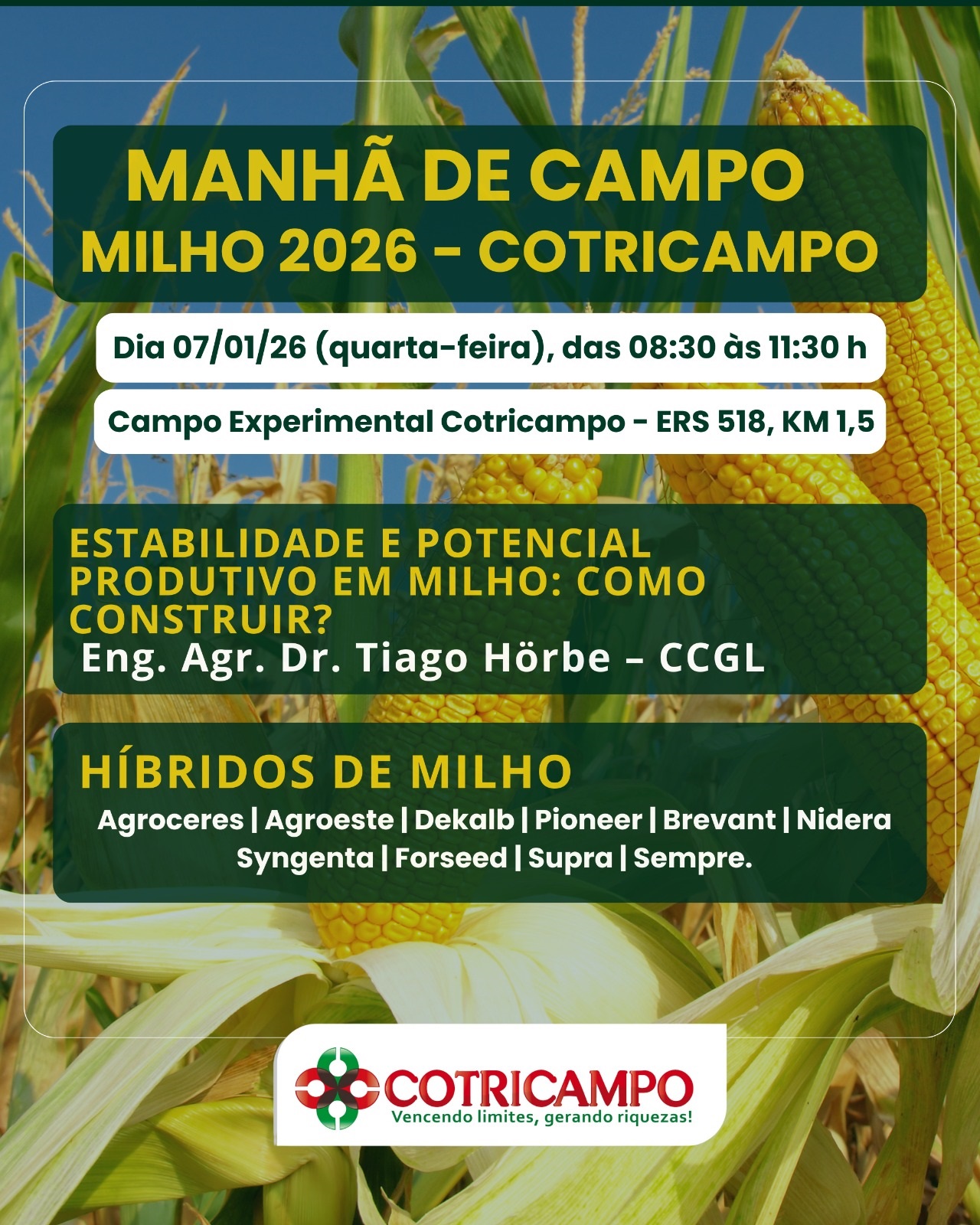 Nesta quarta-feira, dia 7 de janeiro, o calendário de eventos de 2026 da Cotricampo terá início com uma importante atividade, desenvolvida pelo Departamento Técnico da cooperativa (Detec): trata-se da Manhã de Campo da Cultura do Milho, no campo experimental, em Campo Novo, às margens da ERS-518. As atividades ocorrerão das 8h30min às 11h30min. Produtores rurais de toda a região, profissionais do setor agropecuário, estudantes, pesquisadores e demais interessados, estão convidados a participar do evento técnico.